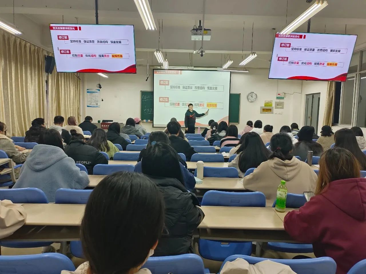 靳景老师层次分明地讲授了入党的各个步骤。首先是从申请入党,明晰团组织推优的基本要求,入党积极分子递交和接收入党申请书,党组织派人谈话。紧接着是入党积极分子的确定和培养,预备党员的接收,包括支委会审查。最后是预备党员的教育、考察和转正,包括编入党支部和党小组,进行入党宣誓。