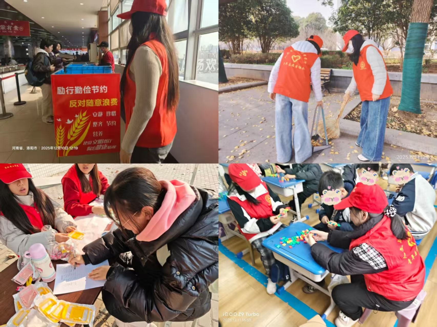 志愿者们身着红色志愿马甲,手持扫帚、垃圾夹等工具,在飘雪的校园里清扫路面落雪与杂物,让覆雪的路面重归整洁;他们在食堂内站岗值守,引导学生文明就餐、节约粮食,维护就餐秩序;傍晚时分还前往教学楼,细致检查每间教室的灯、窗,将节能理念化为实际行动。风雪中忙碌的红色身影,成为校园里最温暖的风景线。