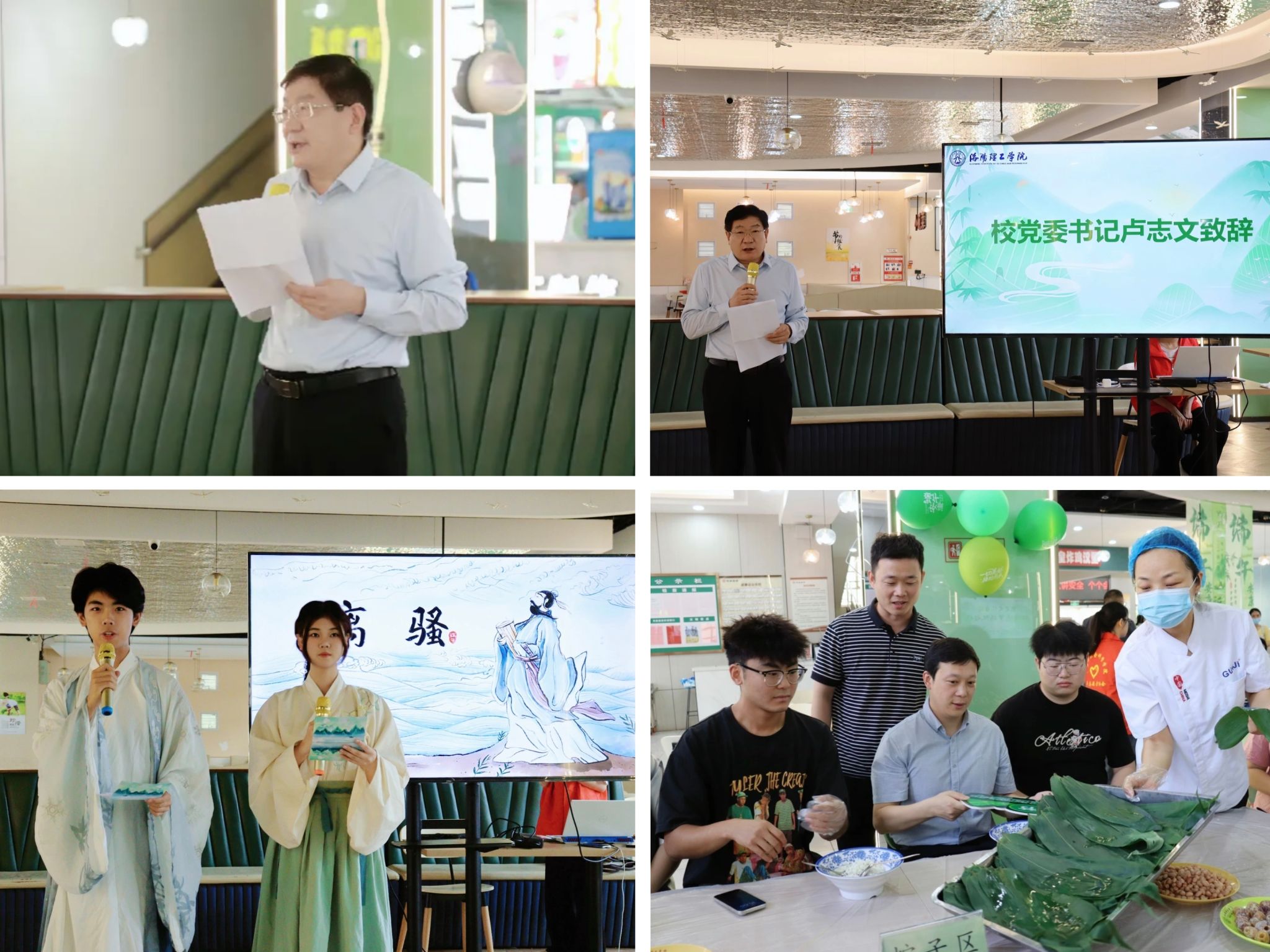 为深入学习贯彻习近平总书记在河南考察时的重要讲话精神,进一步传承好中华优秀传统文化,增强师生文化认同感,坚定文化自信,5月31日下午,在毕业季和端午节交汇之际,由王城社区一站式学生社区和后勤保障处主办、人文学院承办的”坚定文化自信 纵情逐梦 扬帆起航”端午主题活动,在王城校区铭一餐厅举行。校党委书记卢志文出席活动,相关职能部门负责人及二级学院师生代表共200余人参加活动。
