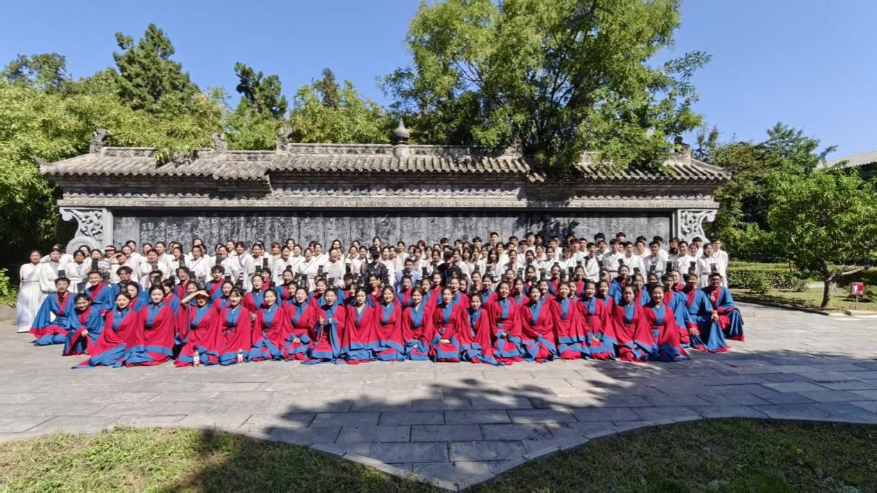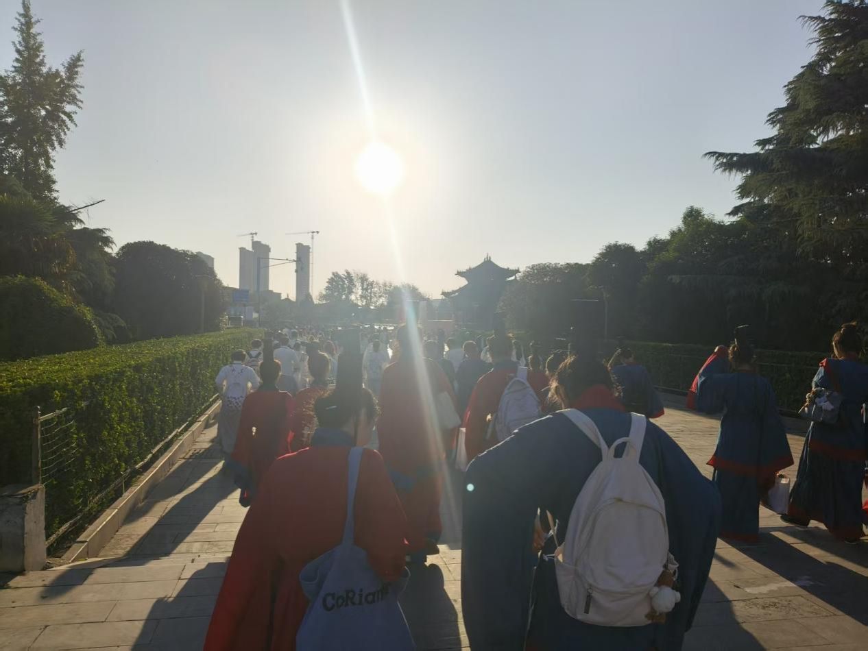 清晨的关林景区,秋阳温暖和煦,澄澈蓝天如一块巨大的宝石,为这场文化盛会铺就了明朗而庄重的底色。早上7点40分,距离大典正式开始还有一段时间,人文学院参与大典的同学们就已准备妥当,按照排练的指定位置整齐集合。他们各有分工,7名同学扮演礼宾,64名同学进行八佾舞展演,100名同学为百家姓旗手。他们身着精心准备的传统服饰,款式多样,有的服饰飘逸素雅,似山间清风、云中流岚;有的则庄重明艳,如烈焰绽放、霞光万道。同学们个个精神抖擞,眼神中满是期待与认真,静静等待着大典拉开帷幕,那场景仿佛一幅提前展开的传统文化画卷。