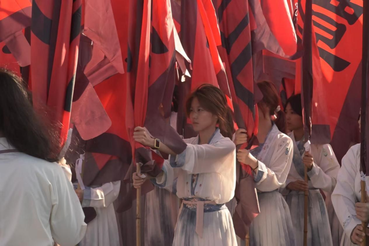 百家姓旗手率先行动起来。他们身着飘逸素雅的传统服饰,手中紧握着带有古朴字体的红旗,开始了交错摇旗的表演。