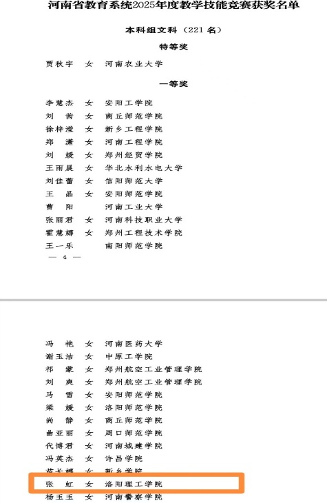 近日,河南省总工会、河南省教育厅联合发布《关于河南省教育系统2025年度教学技能竞赛获奖情况的通报》(豫工文〔2025〕73号),我院张虹老师荣获本科组文科一等奖。