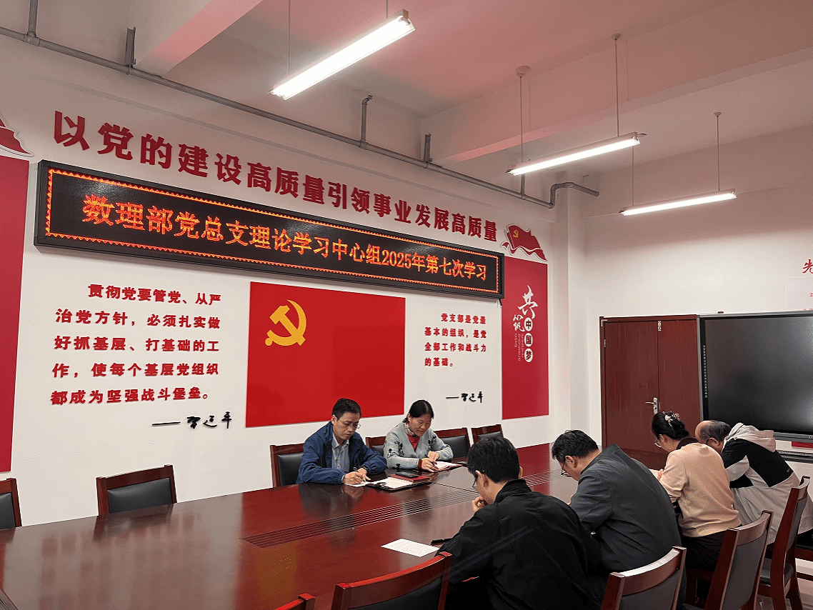2025年10月16日下午,数学与物理教学部党总支理论学习中心组在图书馆902室召开专题学习会,深入学习领会《习近平谈治国理政》第五卷,自觉用党的创新理论武装头脑、指导实践、推动工作。