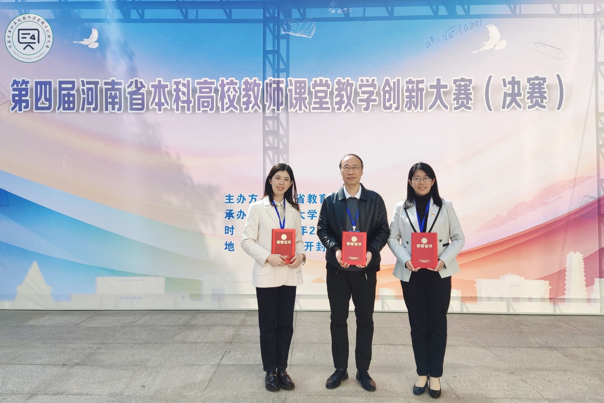 洛阳理工学院魏巍、景元萍、王晨钰3名教师分获大赛一等奖,图为他们在本届大赛决赛现场获奖后合影留念