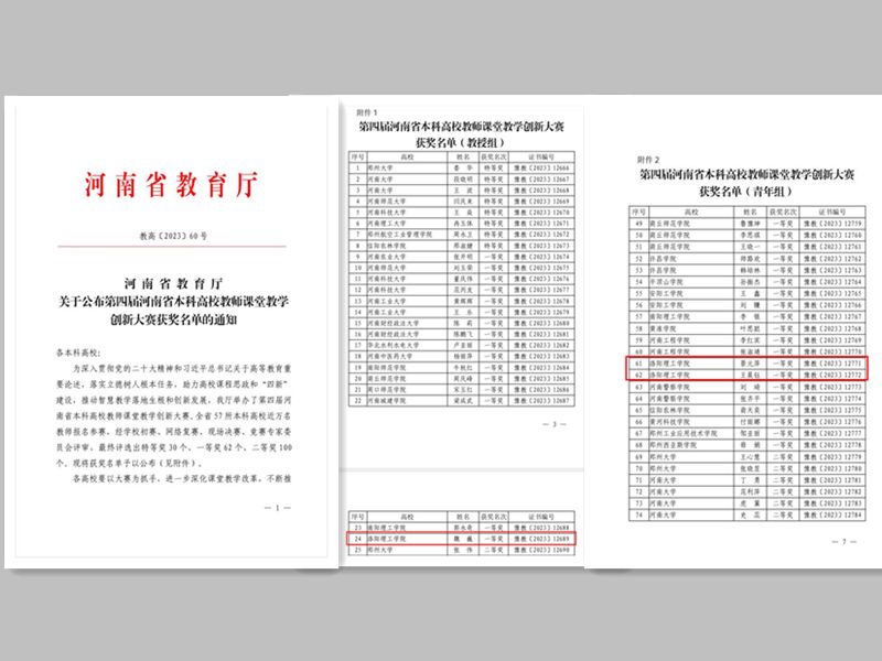 近日,河南省教育厅下发《关于公布第四届河南省本科高校教师课堂教学创新大赛获奖名单的通知》(教高〔2023〕60号),洛阳理工学院3名教师获奖,其中,数学与物理教学部魏巍老师获得教授组一等奖,数学与物理教学部景元萍老师和外国语学院王晨钰老师分别获得青年组一等奖。