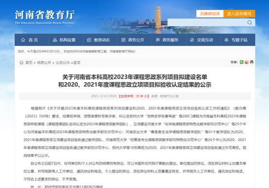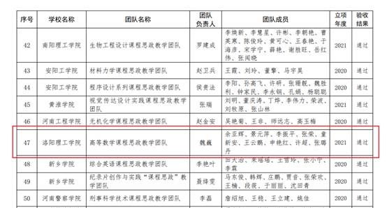 近日,河南省教育厅发布《关于公布河南省本科高校2023年课程思政项目建设名单及2020、2021年度立项项目验收认定结果的通知》,我部门高等数学课程思政教学团队顺利通过省级验收。