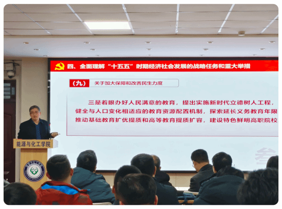 为深入学习贯彻党的二十届四中全会精神,引导师生准确把握全会核心要义和实践要求,12月23日下午,副校长王新武在王城校区DN304 能源与化工学院会议室作专题宣讲。发展规划处、教务处、能源与化工学院、生命科学与健康工程学院、工程训练中心(创新学院)60余名师生代表参会学习,共同凝聚思想共识、汇聚奋进力量。