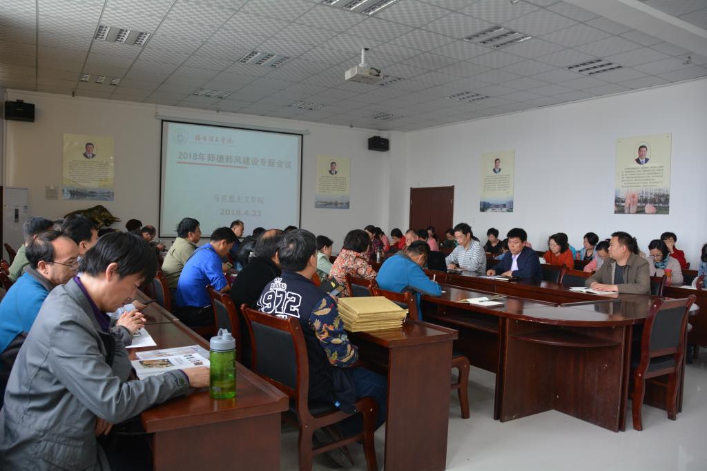 4月23日下午,我院召开2018年师德师风建设工作专题会议。全体教师签到参加,会议由院长苗国强主持。