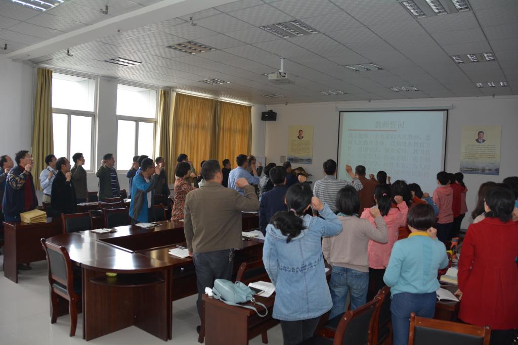 党总支书记李反修首先传达了学校师德师风建设工作专题会的精神,分析了学院师德师风建设方面存在的苗头性问题;重新学习解读了《高等学校教师职业道德规范》和高校教师“红七条”,要求全体教师要高度重视师德师风建设和意识形态工作的极端重要性,自觉肩负起立德树人的历史使命,积极参加“不忘初心立德树人”主题教育活动,争做“有理想信念、有道德情操、有扎实学识、有仁爱之心”好老师,在成为学生健康成长的指导者和引路人方面多思考多努力多奉献。最后,在副院长卢爱新的带领下,全体教师重温了“河南教师誓词”。