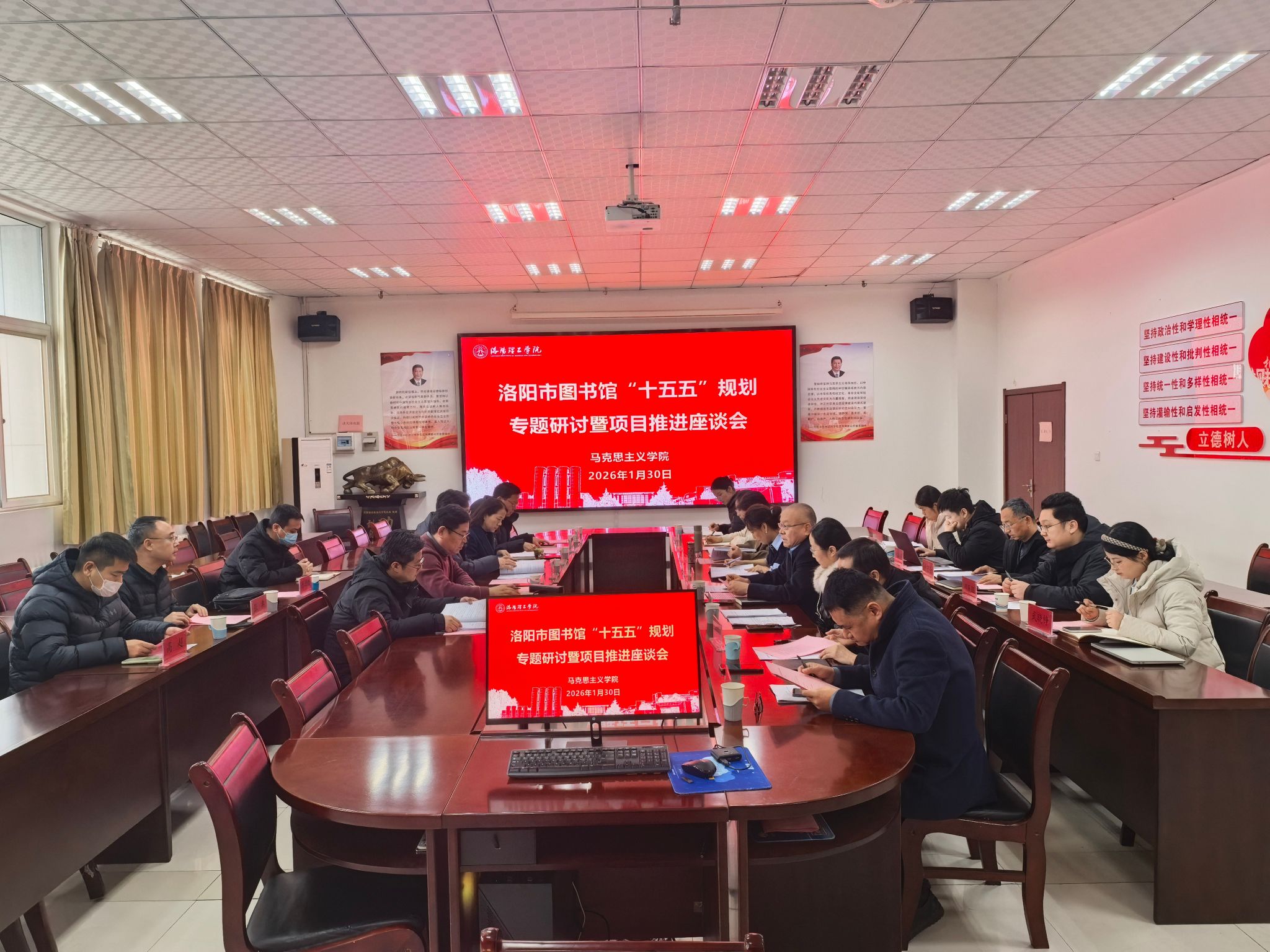1月30日,洛阳市图书馆“十五五”规划专题研讨暨项目推进座谈会在我院召开。洛阳市图书馆班子成员、相关部室一行10人,我院班子成员、项目组成员代表参加会议,座谈会由朱继军院长主持。