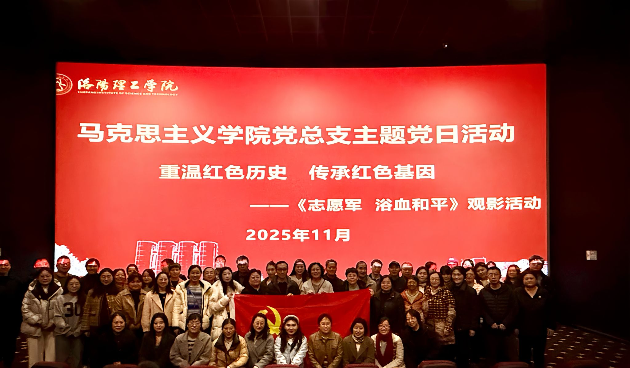为深化爱国主义教育,推动红色资源与思想政治理论课深度融合,2025年11月27日下午,马克思主义学院党总支开展“重温红色历史 传承红色基因”主题党日活动,观看红色电影《志愿军:浴血和平》。学院全体党员教师参加,在光影流转中重温峥嵘岁月,为思政课教学注入鲜活红色动能。