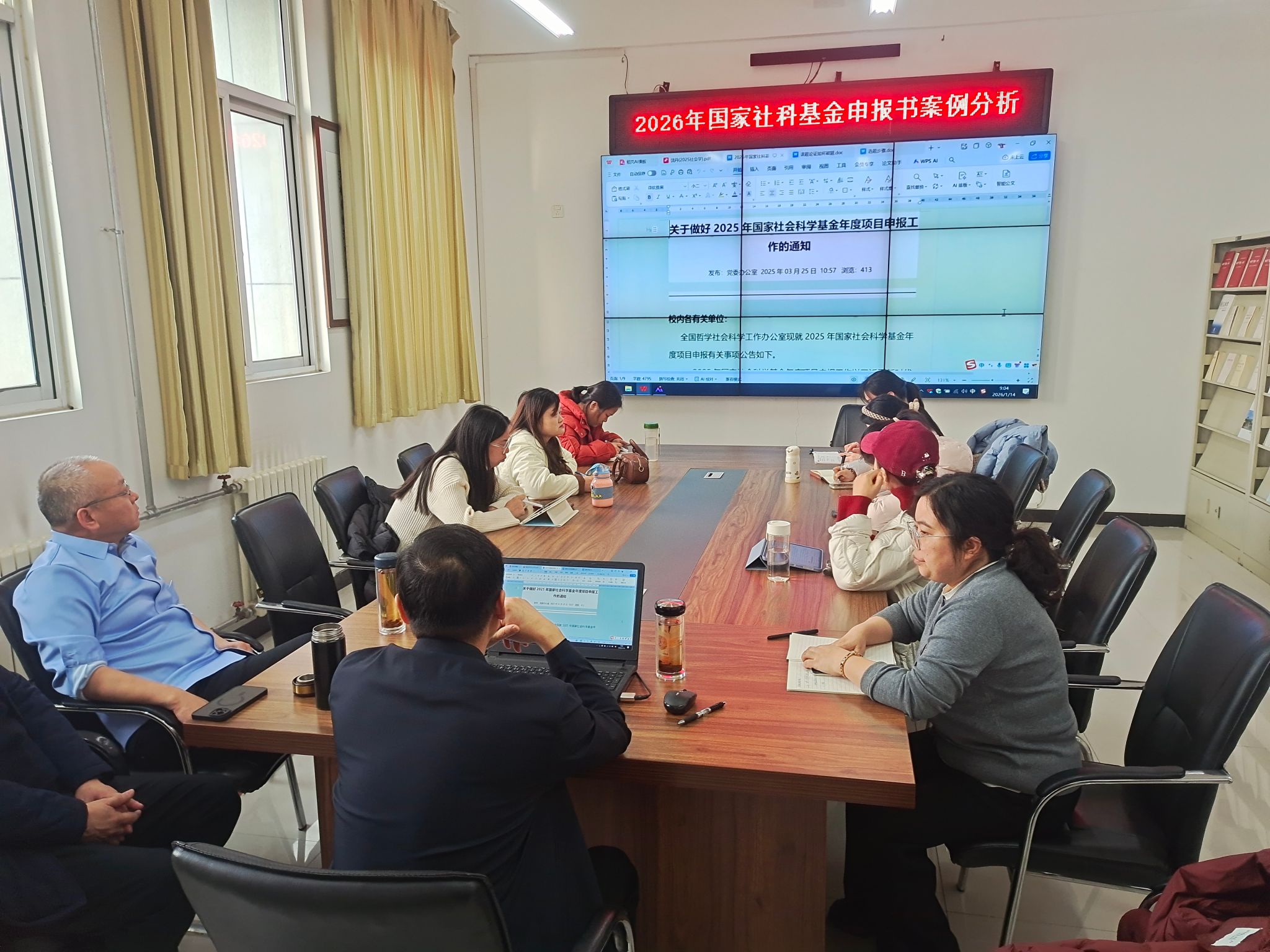 1月14日上午,学院于809教学研讨室举行“2026年国家社科基金申报书案例分析研讨会”,副院长范会勋进行2025年成功案例学习分享,院长朱继军对下一步学院高级别项目申报提出要求,学院青年科研骨干参加。