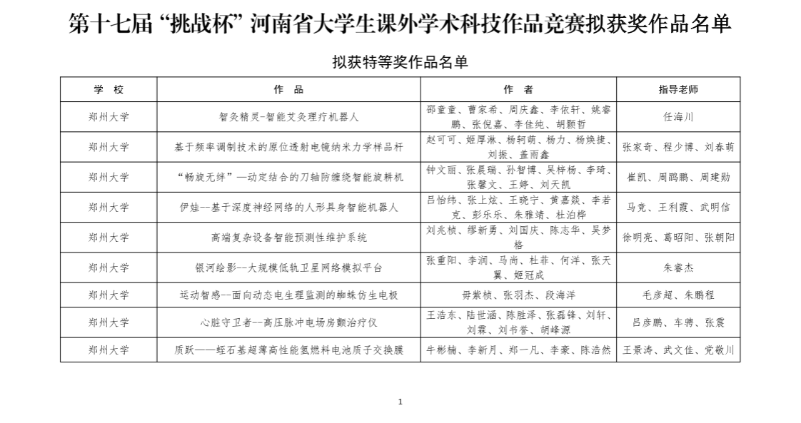 近日,第十七届“挑战杯”河南省大学生课外学术科技作品竞赛获奖结果公布,我院邓辰辉、关姗姗、李喜荣等老师指导的三项作品获得特等奖。
