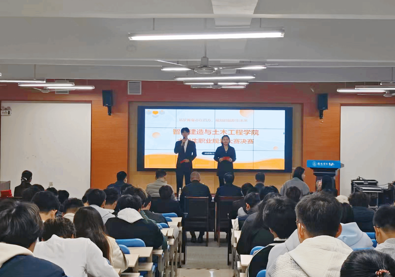 为提升大学生职业规划意识与求职就业能力,帮助同学们明确职业方向、适配行业需求,11 月 13 日,我院大学生职业规划大赛决赛在王城校区土木楼 FS602 会议室成功举办。学院党委书记毛伟伟、党委副书记杨桢,土木工程(中外合作办学)专业系主任赵建建、智能建造专业系主任陈易飞,以及学工办副主任邵悠然、团委副书记李娈启、就业指导办公室副主任郑博担任评委,全院各年级参赛选手及学生代表共同见证这场青春与梦想的盛会。