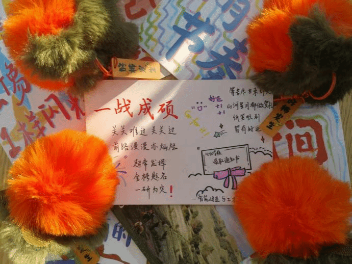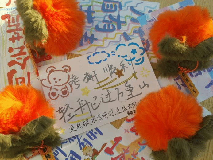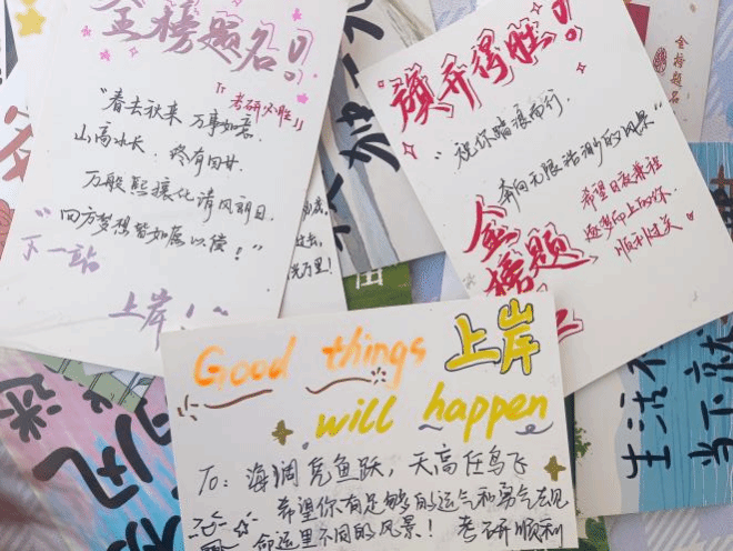 早在之前,同学们就已写下对考研学长学姐的真诚祝福。一张张明信片上,既有俏皮的涂鸦,也有真挚的话语:“愿你落笔生花,金榜题名!”“一研为定,定为研一!”每张卡片都承载着学弟学妹和老师们的深深祝愿。