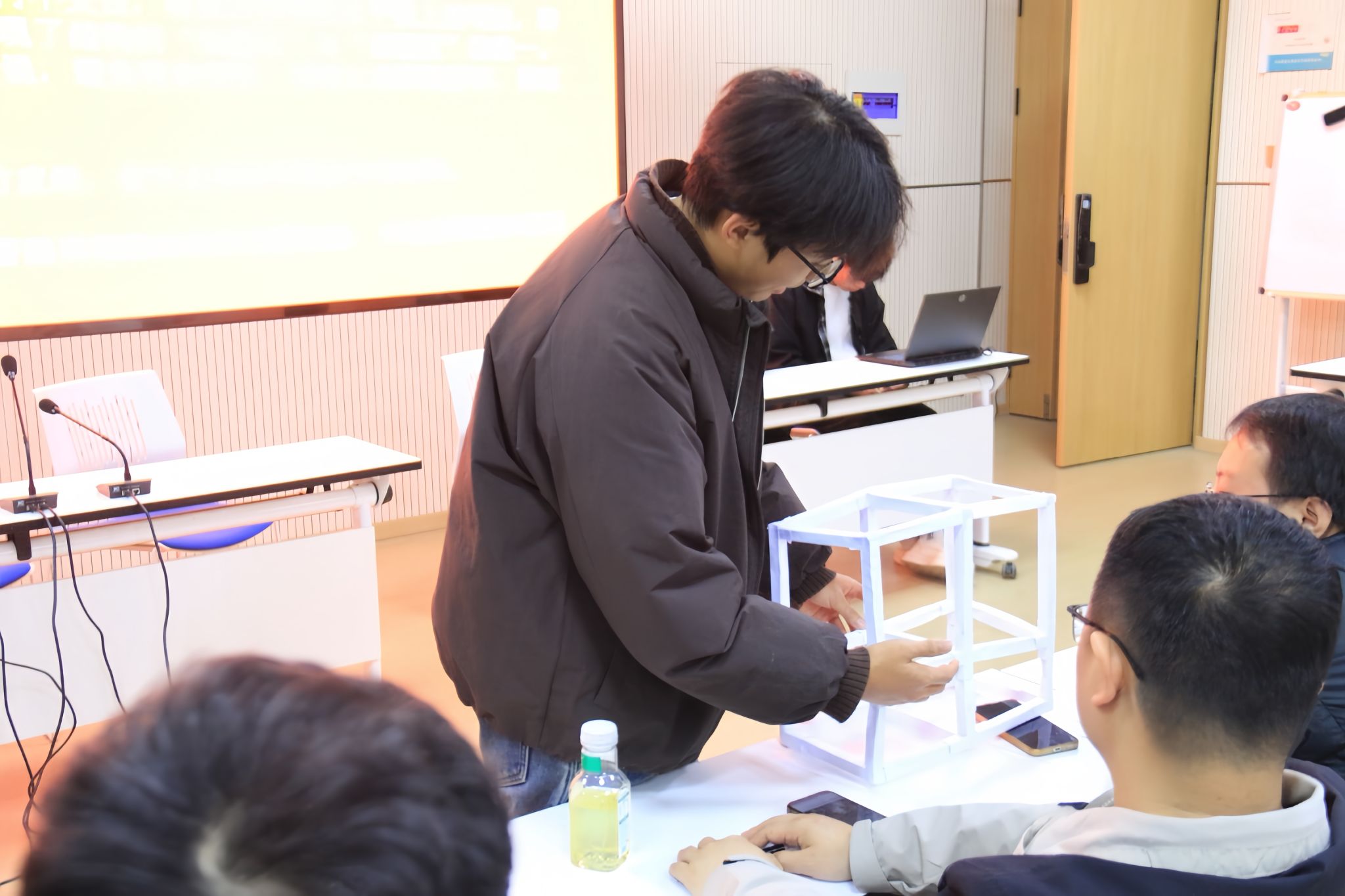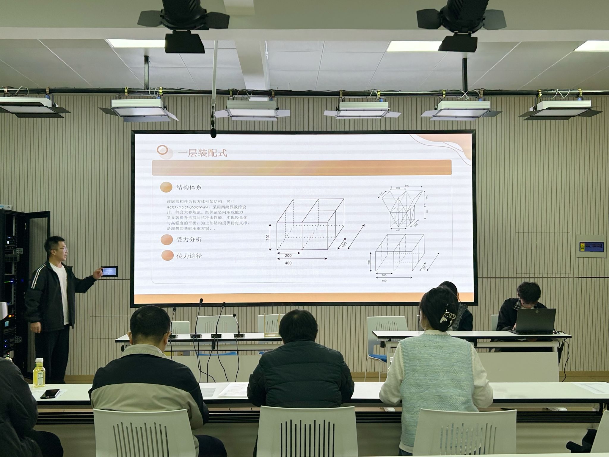 各参赛队伍依序上台,阐述自身的结构设计、节点连接及受力思路,展示模型草图,并认真回应评委提问。