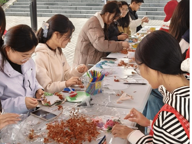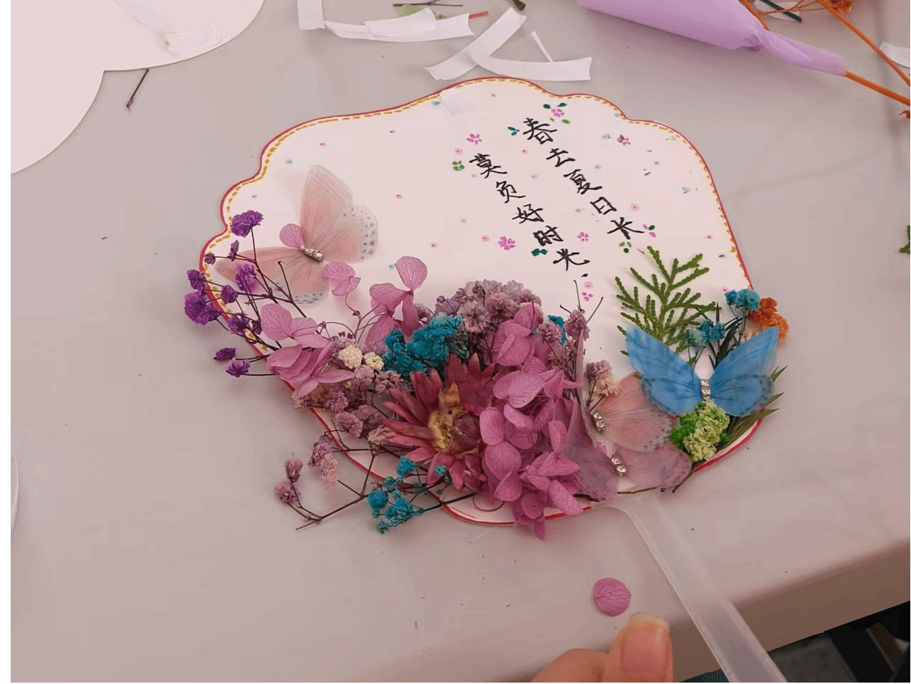 在整个创作过程中,大家专注于指尖的美好,仿佛时间都为他们静止。学业的忙碌与生活的烦恼,都被暂时抛到了九霄云外。现场不时响起关于创意构思的热烈讨论声,以及完成作品后的欢快笑声,那是对自己创作成果的肯定,也是对这段美好时光的纪念。团扇不仅承载了秋日诗意,更成为了传递温暖与情绪的独特载体。