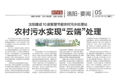 目前主要有“智慧型一体化污水处理设备+5G水处理智能电控柜”的智慧型一体化污水处理设备(出水优于《河南省农村生活污水处理设施水污染物排放标准( DB411/820-2019)》)、“5G水处理智慧云电控柜”等系列技术,已经分别应用到国药集团(焦作市武陟县)项目1200吨/天,洛阳市、焦作市、新乡市等40余个乡镇污水处理项目。因出水水质长期稳定达标,受到了当地新闻报道。