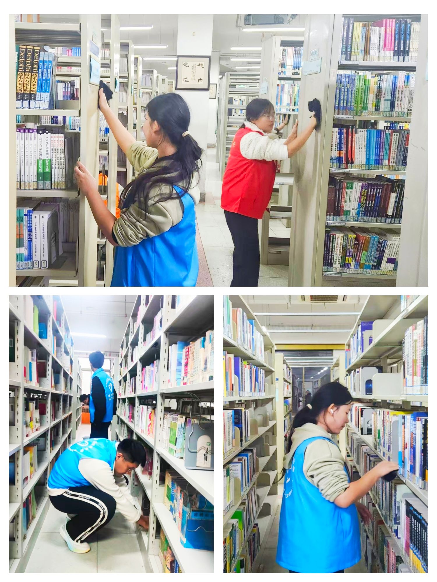 活动期间,志愿者们热情高涨,迅速投入到各项任务中。他们分组协作,有的负责清扫书架上的灰尘,有的专注于整理杂乱的书籍,还有的对书库地面进行深度清洁。在整理图书时,志愿者们认真对照分类索引,将一本本散落的书籍精准归位,确保读者能够更便捷地查找资料;清洁过程中,大家不放过任何一个卫生死角,力求为师生打造一个窗明几净的阅读空间。尽管工作任务繁重,但志愿者们毫无怨言,始终保持着积极的态度,有条不紊地推进各项工作。