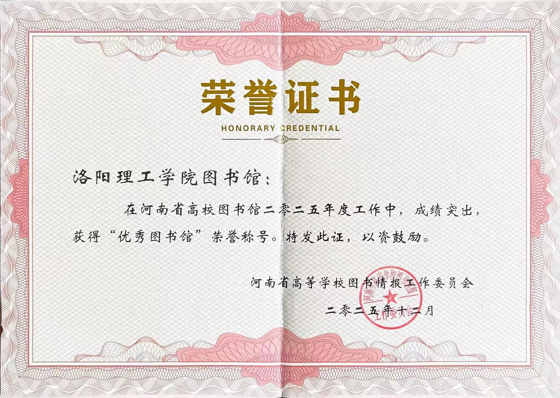 近日,河南省高等学校图书情报工作委员会发布《关于河南省高校“优秀图书馆”“优秀图书馆员”的表彰决定》(豫高校图工委〔2025〕21号),我校图书馆荣获2025年度河南省高校“优秀图书馆”称号,同时,我校杨建玲、闫海、刘沛武、丁建辉、王蕾红、党新杰等6名馆员荣获“优秀图书馆员”荣誉称号。