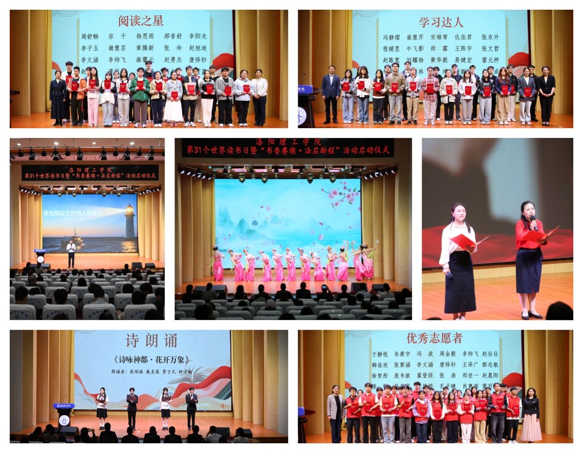 4月22日下午,洛阳理工学院第31个世界读书日暨 “书香赓续・法启新程”活动启动仪式在王城校区图书信息中心报告厅举行。党委副书记、工会主席曾涛,副校长冯超、李传锋出席启动仪式,党委宣传部、党委学生工作部、教务处、校工会、校团委、图书馆等相关部门负责人及师生代表400余人参加仪式。