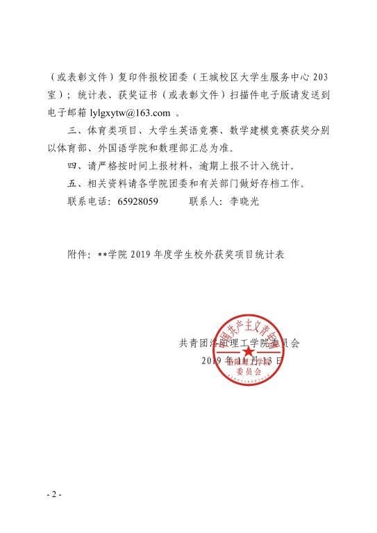 团内通知 团内通知 关于在学校第12期河洛... 洛阳理工学院关于开展2... 洛阳理工学院关于开展2... 洛阳理工学院关于开展2... 关于在学校第12期河洛... 当前位置: 网站首页 >> 旧版 >> 团内通知 >> 正文 关于统计2019年度我校学生参加校外各类竞赛获奖情况的通知 附件【附件______学院 2019 年度学生校外获奖项目统计表.docx】已下载次