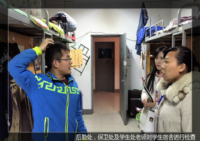 12月1日学校后勤服务集团、保卫处、学生处三部门联合对我校王城、开元、九都三个校区的宿舍楼展开突击检查。此次检查主要针对学生宿舍的卫生和消防安全等问题,着重检查管制刀具、反限电插座、酒精锅等严重违禁品;同时对学生在宿舍内使用吊床吊椅,堆放易燃物品等行为进行安全教育并勒令整改。