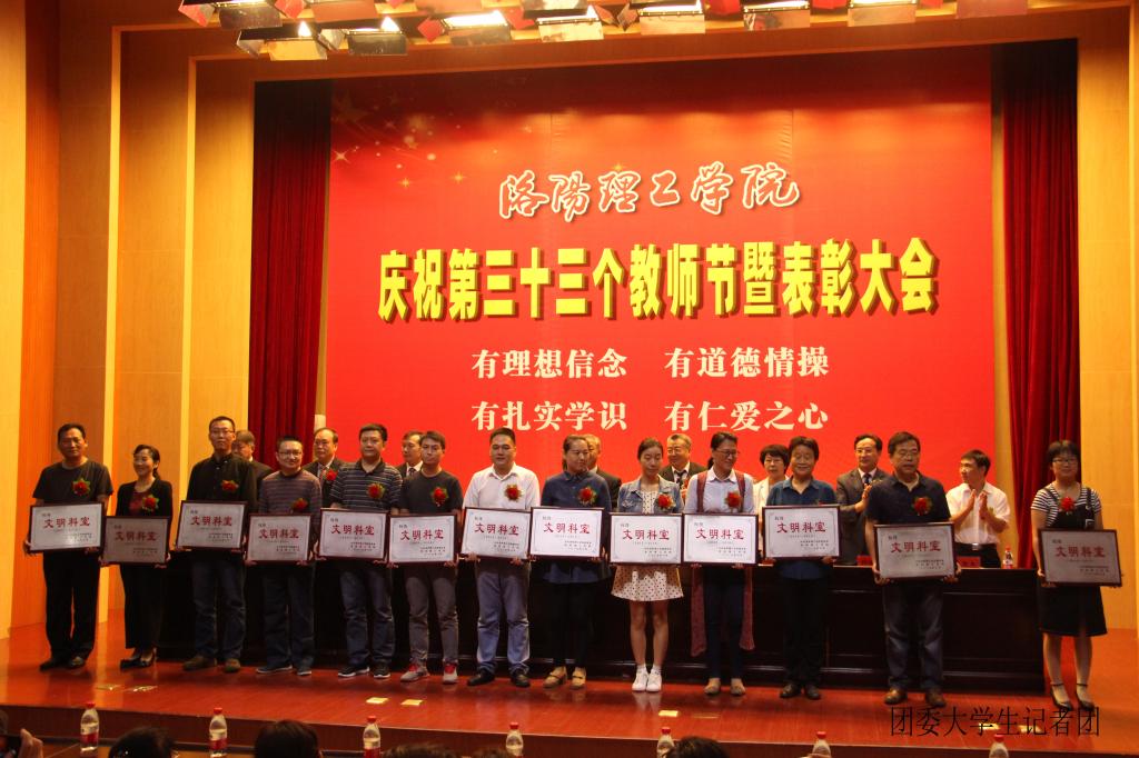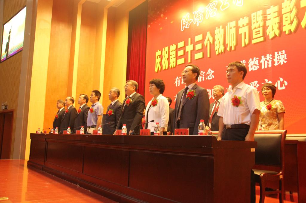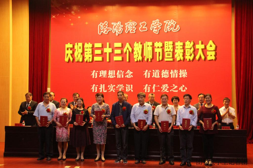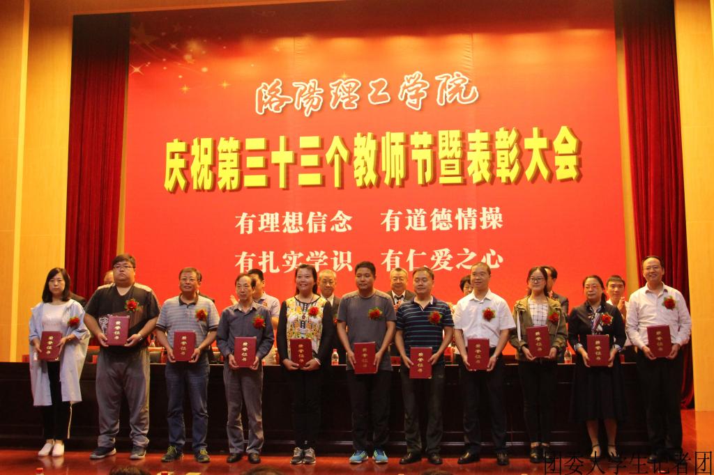 9月10日上午,我校庆祝第三十三个教师节暨表彰大会在王城校区图书馆学术报告厅成功举行。大会表彰了2016—2017学年优秀教师和优秀教育工作者,2015—2016年文明集体、文明个人,校本部“从教满三十年”人员。洛龙区委书记孙延文,(代)区长张玉杰,校领导苟义伦、屈凌波、陈岩、葛玻,等出席会议,中层以上干部,学生代表参加会议。