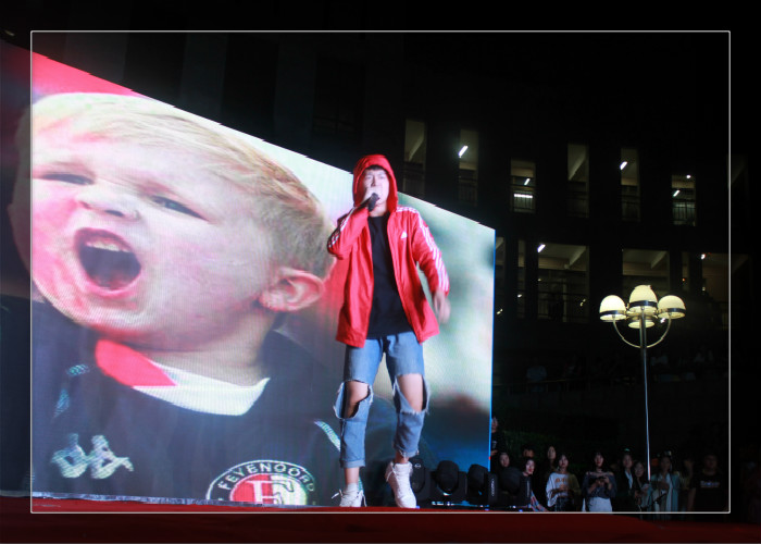 伴随着强劲的重低音,炫目的镁光灯闪烁,开场舞《潮引力》震撼心灵,全场响起一片欢呼;紧接着现场乐队LIVE演唱《当你》鼓动人心;之后的独唱、劲舞、小品、古筝演奏、吉他演奏、歌曲串烧等节目接踵而至,精彩纷呈;中国有嘻哈节目里广泛流行的一首RAP《变》更是嗨翻全场。此外节目间歇还有微博上墙、电话快打等形式选取现场幸运观众,让现场惊喜不断。