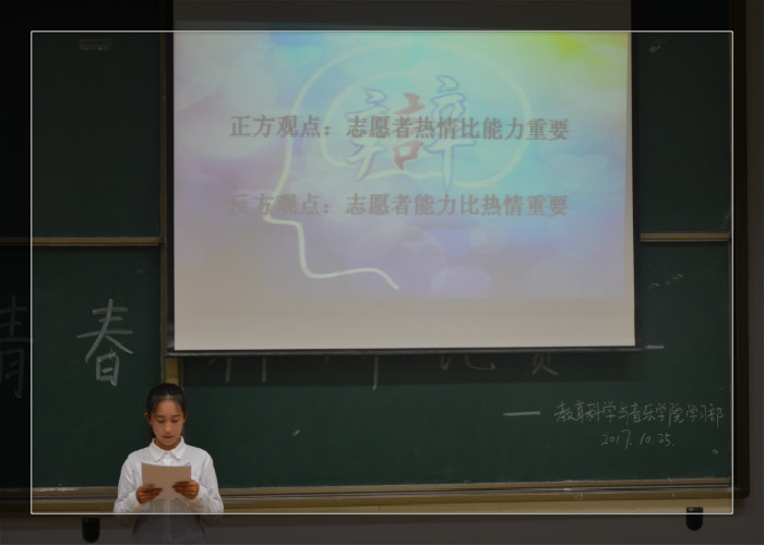 10月25日晚,由教育科学与音乐学院学习部主办的第七届“青春杯”辩论赛初赛第一场于我校开元校区F205举办,学生会副主席、青协副主席等学生干部担任评委。