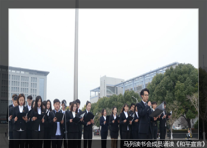 10时整,纪念仪式在肃穆的气氛中正式开始。全场师生高唱《中华人民共和国国歌》,并对南京大屠杀死难者同胞默哀。“巍巍金陵,滔滔大江,钟山花雨,千秋芬芳。一九三七,祸从天降,一二一三,古城沦丧……”,30名校马列读书会成员齐声诵读现代诗歌《和平宣言》,表达了对战争愤怒和控诉,对遇难者的哀思与悼念,更抒发了对和平生活的美好向往,引起在场师生的强烈共鸣。