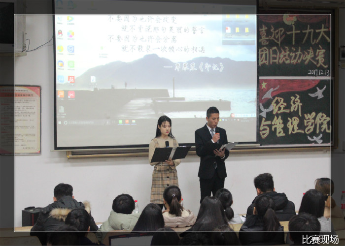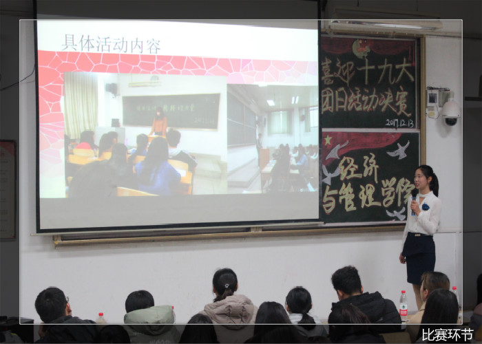 12月13日晚,经济与管理学院“喜迎十九大”特色团日活动ppt答辩决赛于我校开元校区XB1教室隆重举行。担任本次比赛的评委有经管学院团委常务副书记,团委副主席,团委办公室主任等团委学生会成员。出席本次比赛的嘉宾有校团委组织部部长,副部长及其他各学院团委组织部长,副部长级成员。