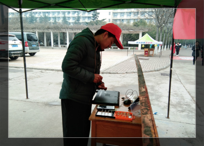 在活动开始前,各部门合理分工。干事们认真服务每一位前来咨询的同学们,耐心的回答他们所咨询的问题,为他们做好详细的信息登记,以积极热情的态度对待这份工作。此次义务维修服务项目主要包括电脑检测、电脑除尘、系统安装与维护、电脑维修常识、以及病毒的查杀与防御等。