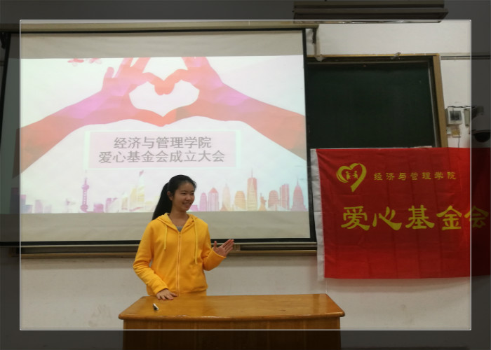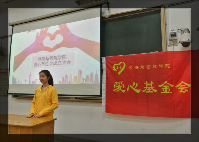 主持人宣读开场白并介绍爱心基金委员会理事及到场嘉宾,爱心基金大会正式开始!随后经济与管理学院团委书记赵锐老师悉心介绍了基金会的相关情况并宣读了《经济与管理学院爱心基金会章程》。最后,伴随着音乐《感恩的心》,主持人宣布经济与管理学院爱心基金会成立大会结束。