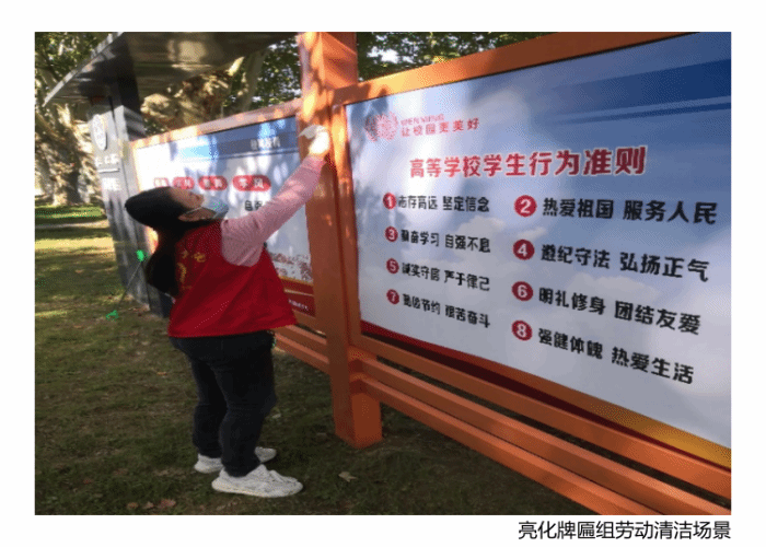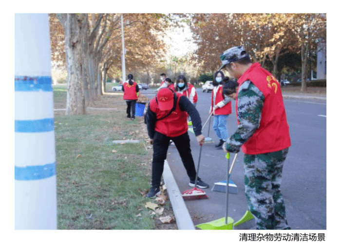 支部党员按照前期的分工,拿着垃圾桶、扫帚、簸箕、抹布、水盆等工具准时到达服务场地,大家身穿红马甲,明确目标后便迅速进入劳动状态。支部成员们齐心协力,分工合作,对每个区域进行了细致的清洁打扫。清理杂物组对整个区域进行无死角的摸排,将区域内的纸屑、塑料袋等杂物收集到垃圾桶内。牌匾亮化组对区域内的指示牌、标识牌、宣传栏进行由内而外、自下而上的清理,多次擦拭,一尘不染。供水保障组的同志不辞辛劳的往返于清洁区域和水房,将一盆盆干净的水送到清洁地点。最后工具收集组在打扫完整个区域后清点、归还了打扫工具。志愿者们并肩劳作,热情高涨,经过两个小时的辛勤劳动,清洁区域焕然一新,党员同志们红色的身影和校园深秋的金黄组成了一副美丽的图片。