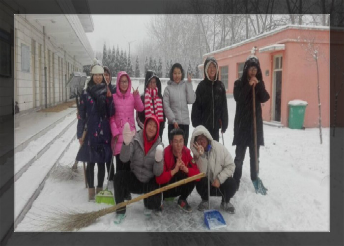 依照事先安排好的活动事务,负责清扫的干事早早带好打扫工具在活动地点等待。干事们清扫时冻僵了双手但没有一分抱怨,坚持着清扫干净主干道上的积雪。