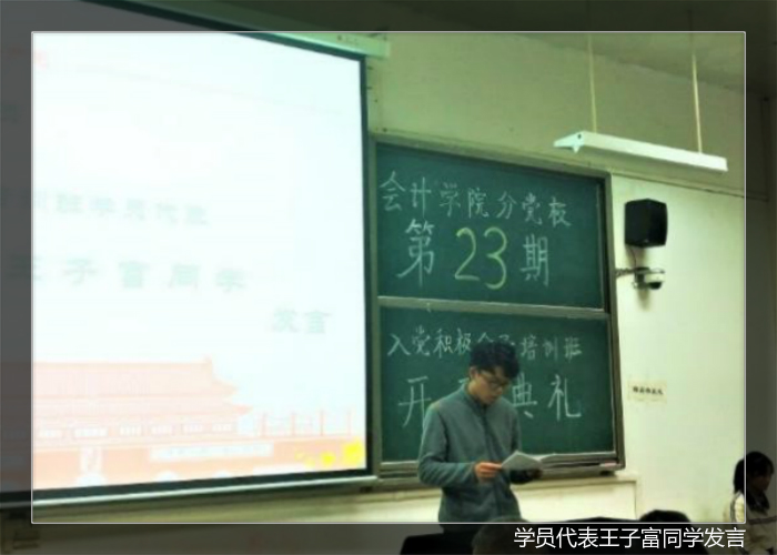 典礼开始,全体唱响《国际歌》。首先,王子富同学作为本期培训班学员代表发言,充分表达对党组织的感谢,表明自己对党课学习的热情,以实际行动争取早日成为一名光荣的共产党员。随后,刘源源老师宣布党课教学安排与学习要求,为学习班学员解读本期学习班的考核办法,着重提到关于结业考试达标分数线、日常考勤等制度。在开班动员报告环节中,刘庆伟老师从“为什么来党校里学习?在培训班能学到什么以及在培训班里怎么学?”这三个方面对在场的积极分子们提出了具体要求,同时指出,作为一名入党积极分子,不仅要不断加强理论的学习,还要践行到学习、生活中,注重学做结合。告诫学员们要坚定信心,经受住考验,祝愿学员都能顺利结业,取得好的成绩。接着,本次党课的负责人对接下来的培训工作提出了一定的要求。通过学员投票的方式选拔班长和组长。最终,会计学院第23期入党积极分子培训班开班典礼圆满结束。