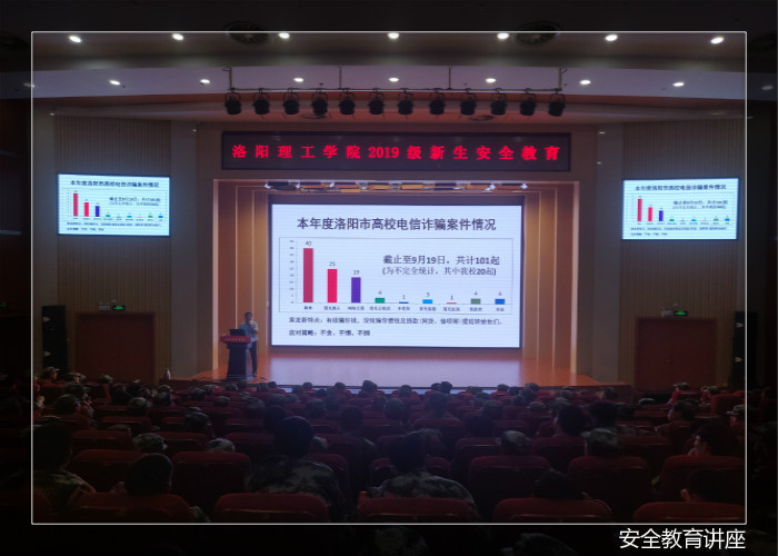 9月19日,环境工程与化学学院和人文与社会科学学院2019级全体新生参加了由保卫处举办的2019级新生安全教育讲座,讲座在王城校区图书信息报告厅举行,保卫处处长张克强博士担任主讲。