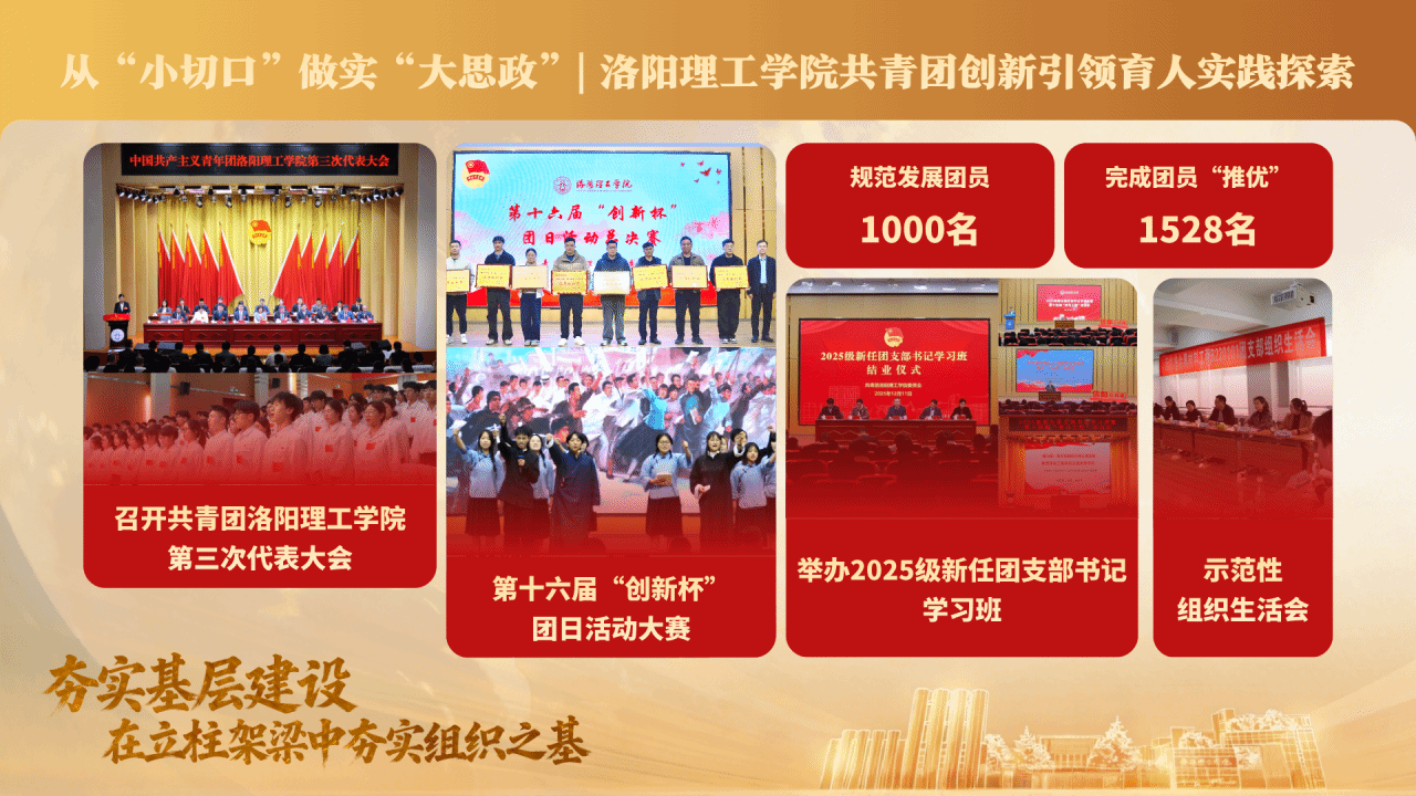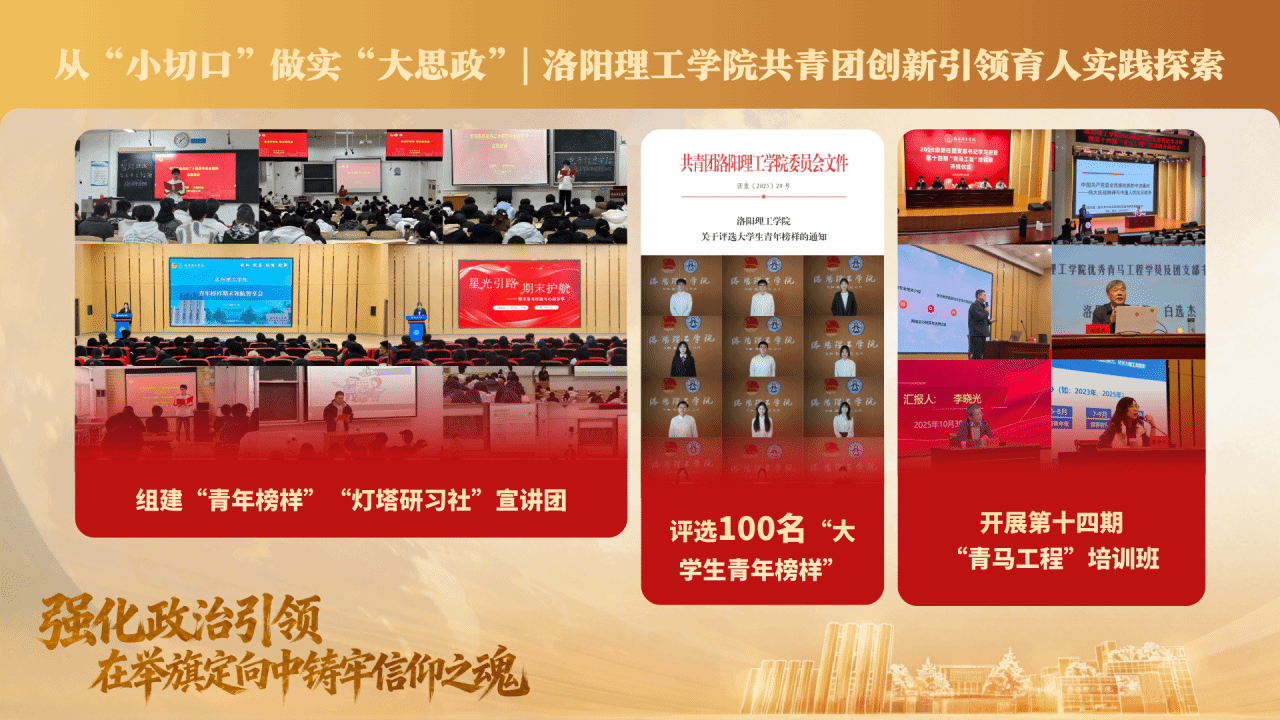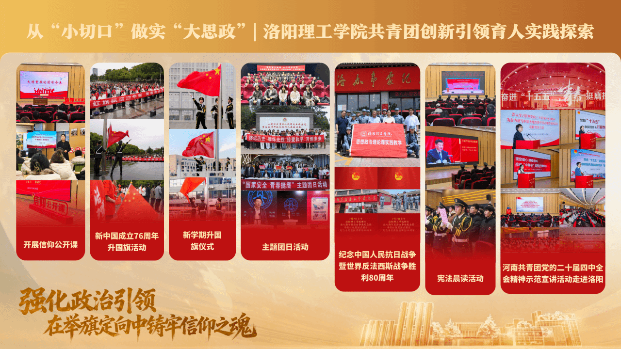 潮起河洛畔,奋楫正当时。洛阳理工学院共青团将持续深化“团马融合” 思政育人范式,始终坚守为党育人、为国育才政治责任,聚力构建更高水平的“三全育人”工作格局和“大思政”育人体系,充分发挥共青团在高校学生思想政治工作中的主力军作用。我们将深耕组织基础、创新实践载体、厚植文化底蕴、拓展网络阵地,紧扣学校“致知、致善、致能、致新”校训与应用型办学定位,引领广大团员青年在强国建设、民族复兴的伟大征程中挺膺担当,奋力书写中国式现代化建设的青春篇章!