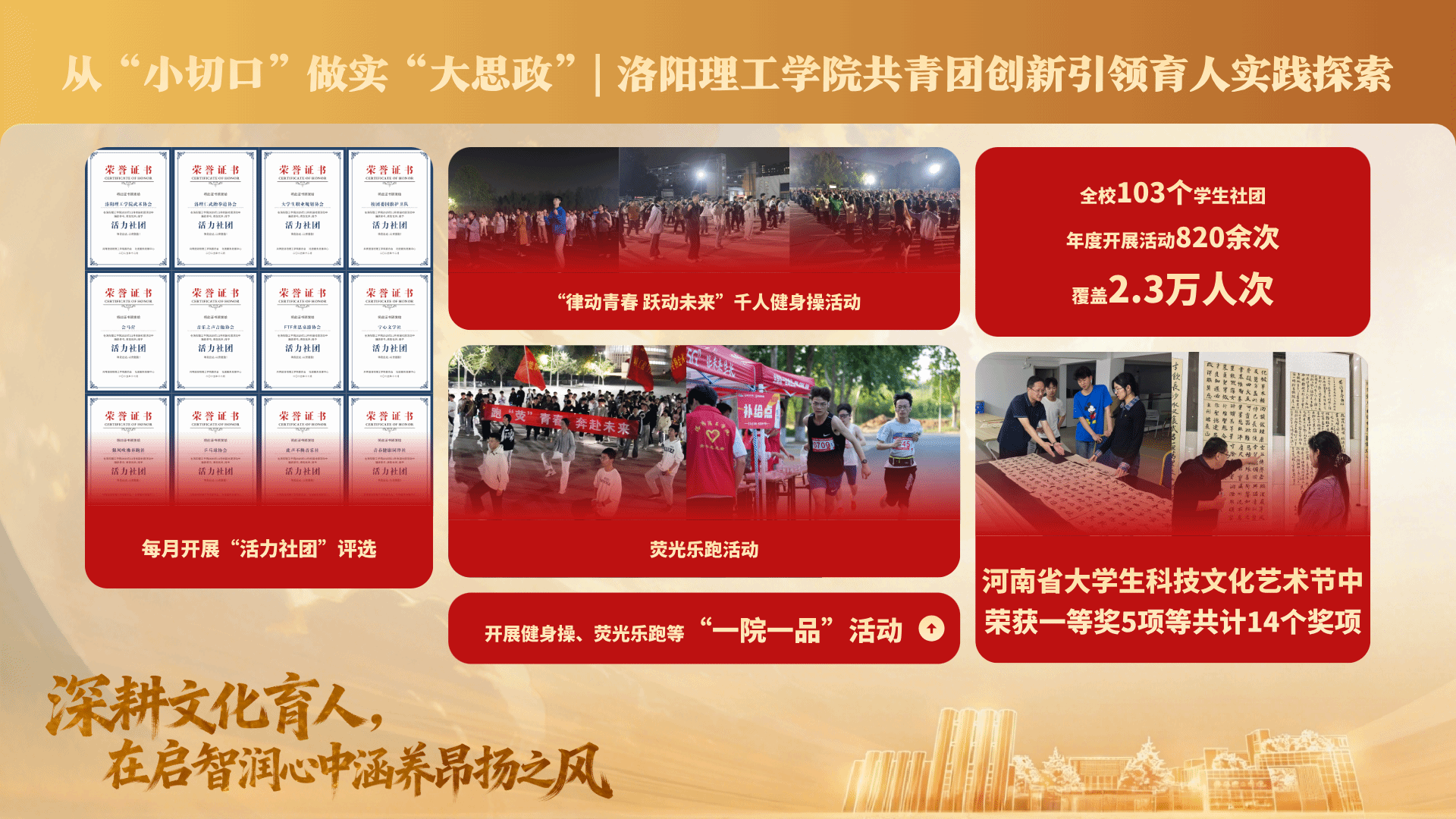 激发社团育人活力:实施社团活力提升计划,全校103个学生社团年度开展活动820余次,覆盖2.3万人次。在河南省大学生科技文化艺术节中荣获一等奖5项等共计14个奖项,充分彰显学子昂扬向上的精神风貌。