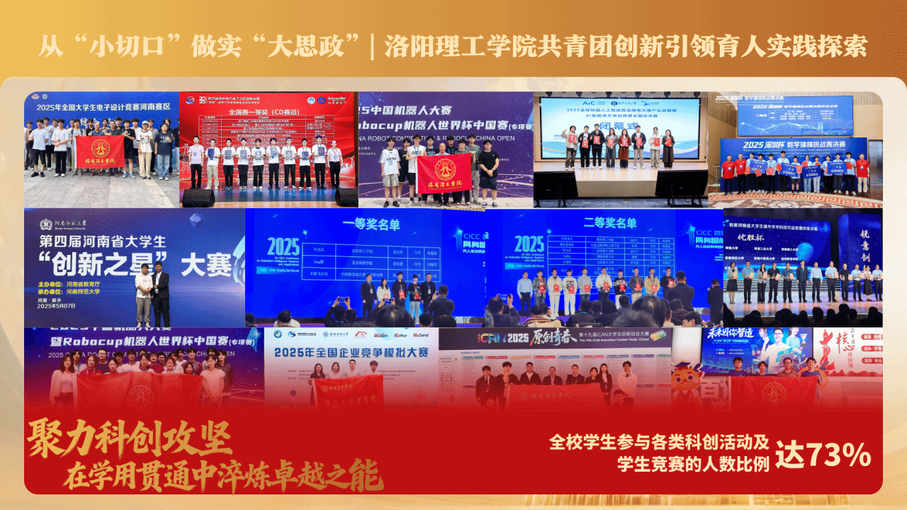 营造浓郁科创氛围:以“科技创新嘉年华”为主线,全年开展各类科创活动近200项,举办指导讲座、项目辅导70余场。全校学生参与各类科创活动及学科竞赛的人数比例高达73%。