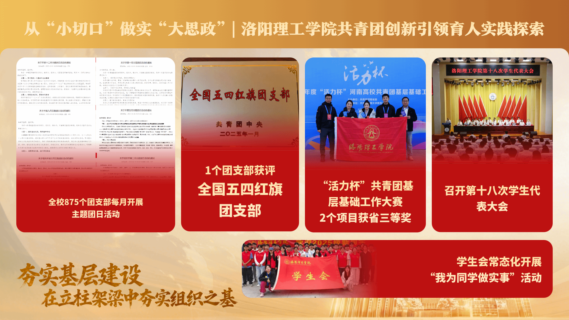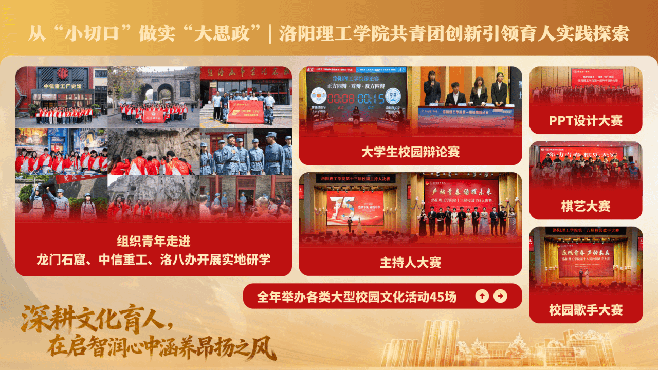 打造品牌文化活动:举办“薪火相传 强国有我”主题系列活动、纪念“一二·九”运动歌咏朗诵比赛等大型校园文化活动45场。组织青年走进龙门石窟、中信重工开展实地研学,在触摸文脉与感受重器中深化文化认同。