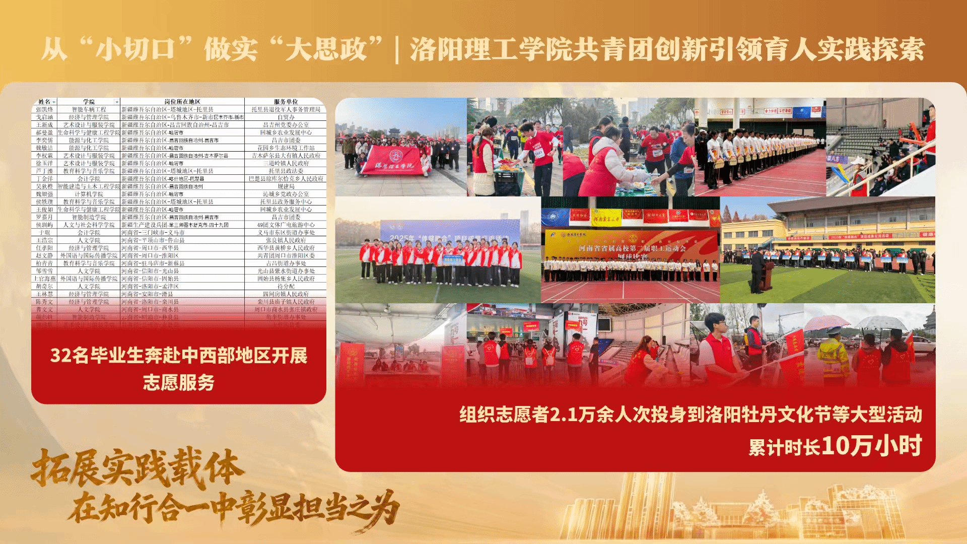 志愿服务常态长效:深化“我的第五节课”校内志愿服务品牌,4支志愿服务宣讲团入选全国志愿宣讲团。围绕地方发展,组织志愿者2.1万余人次投身洛阳牡丹文化节等服务,累计时长10万小时。