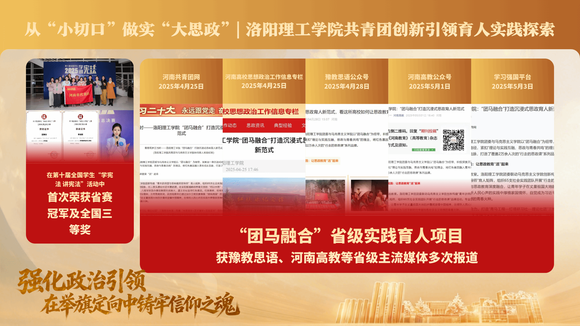 深化“团马融合”协同育人:与马克思主义学院协同打造的“团马融合”省级实践育人项目,育人模式与实践成果获豫教思语、团省委等省级主流媒体多次报道,实现了理论教学与实践育人的深度融合。