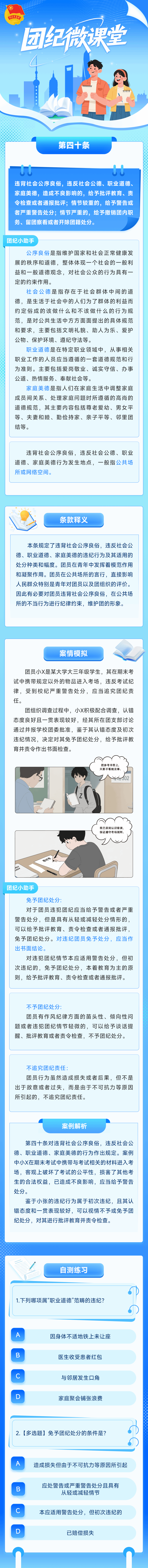 为帮助广大团员深入理解新修订的《中国共产主义青年团纪律处分条例(试行)》(以下简称《条例》),做到学纪、知纪、明纪、守纪,团上海市委组织编写了《团纪微课堂》学习手册,详细介绍《条例》第四章“对违反纪律行为的处分”,帮助团员更好理解各类违反纪律的具体行为及其适用的处分种类和幅度。手册以长图连载形式推送,第五期推出《条例》第四十、四十一、四十二条学习内容。