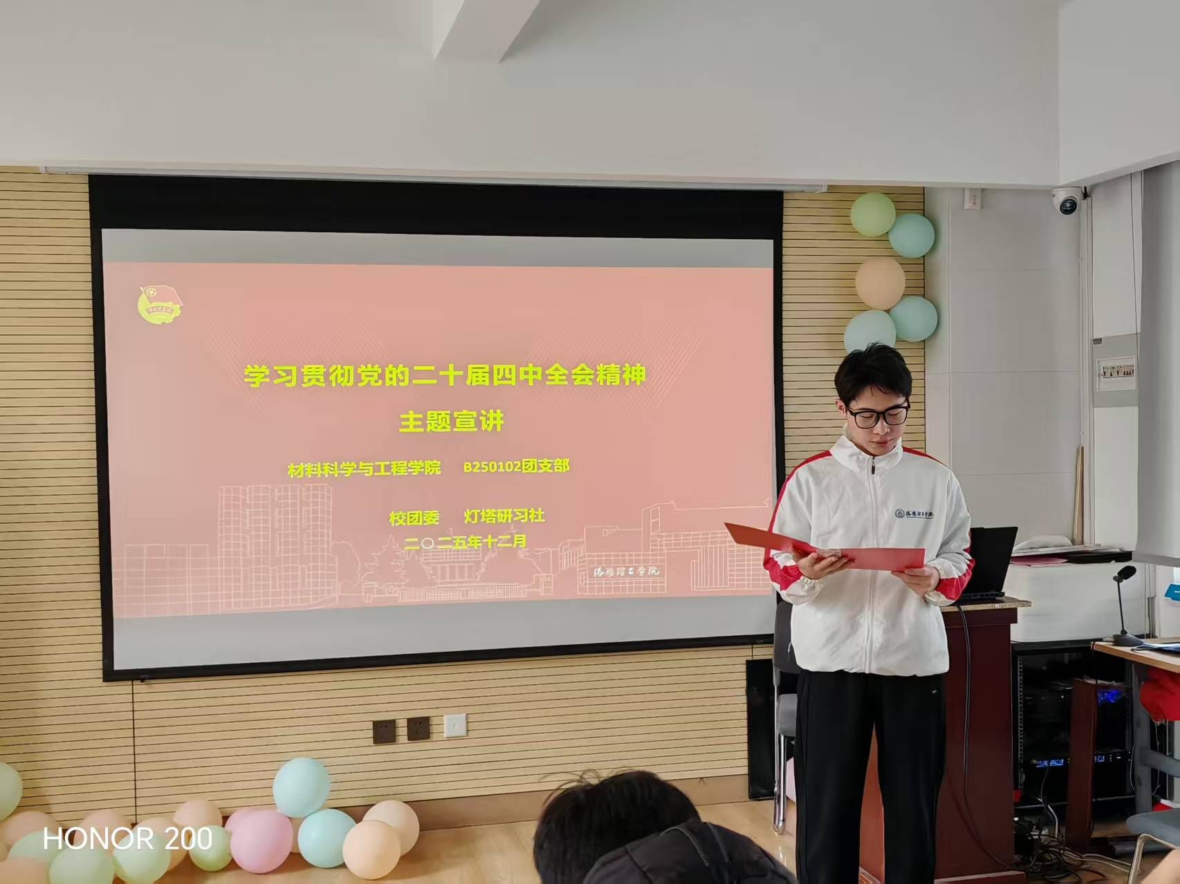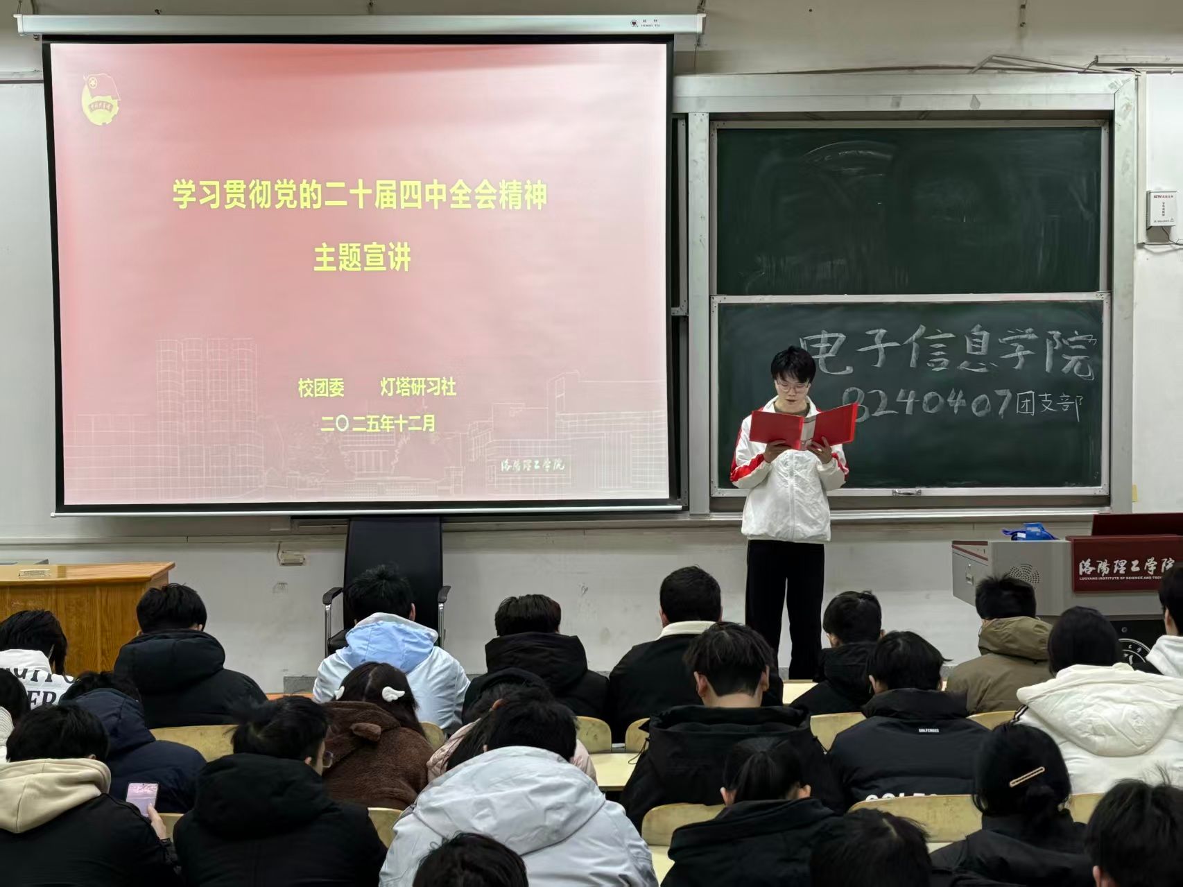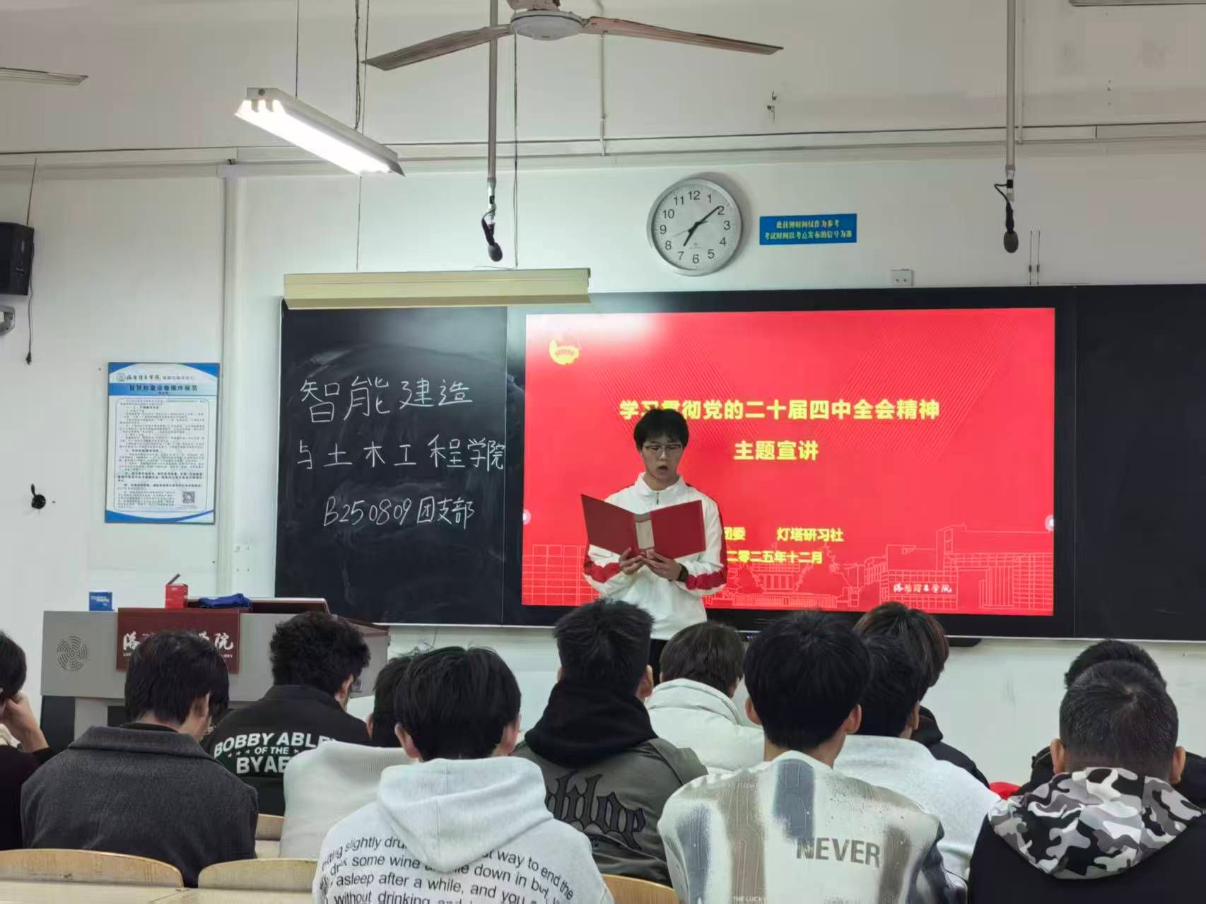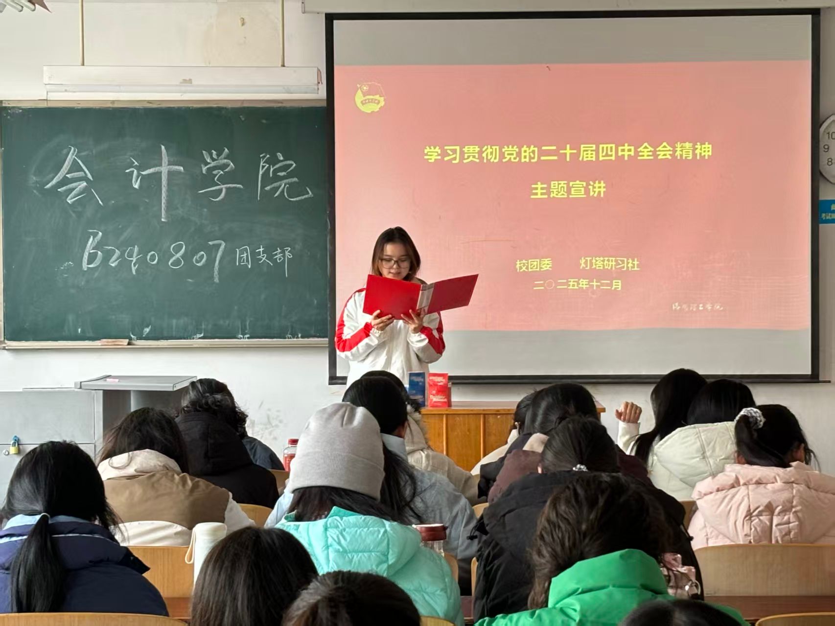 12月8日至12日,校灯塔研习社深入材料科学与工程学院、计算机学院、智能建造与土木工程学院、会计学院、电子信息学院等5个学院的团支部宣讲党的二十届四中全会精神,约200名学生参加