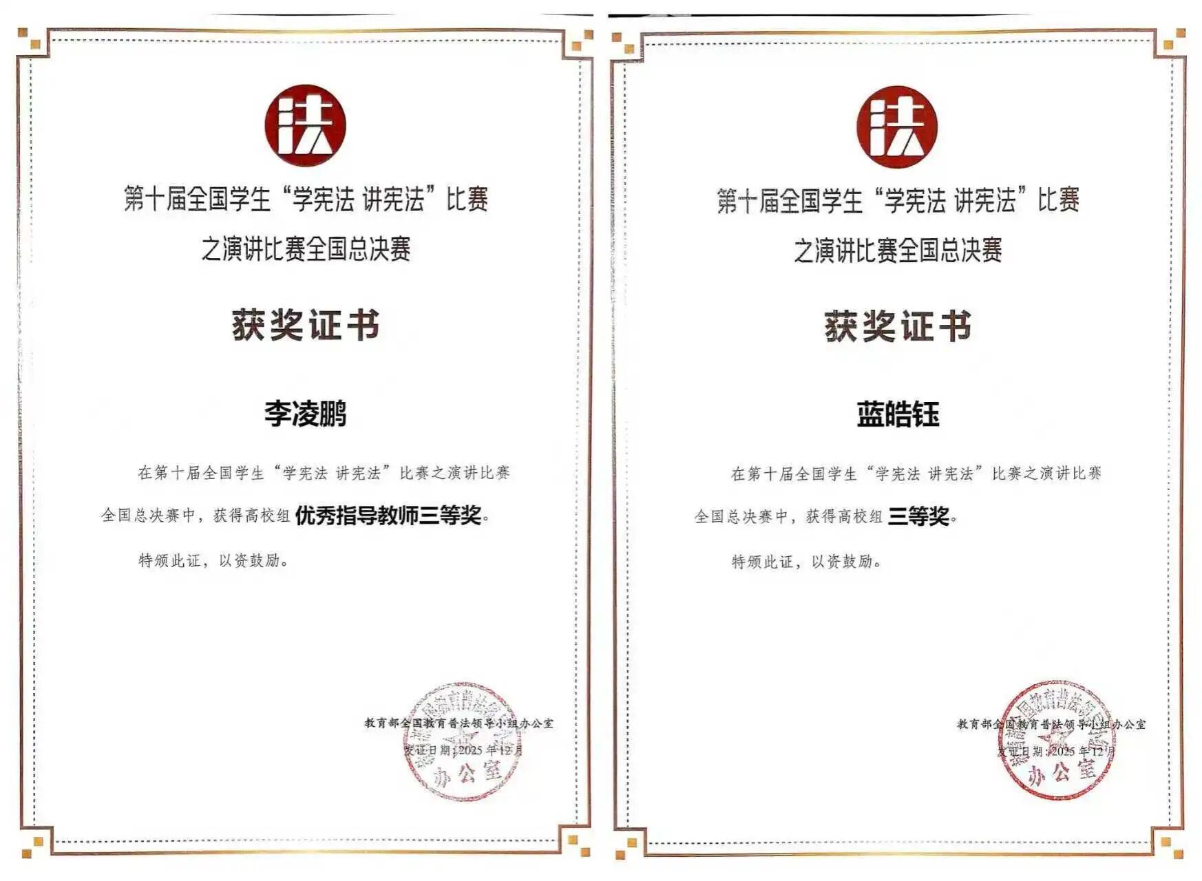近日,第十届全国学生“学宪法 讲宪法”比赛之演讲比赛全国总决赛结果揭晓。我校人文学院新闻学专业2023级学生蓝皓钰荣获全国总决赛高校组三等奖,指导教师李凌鹏荣获高校组优秀指导教师三等奖。