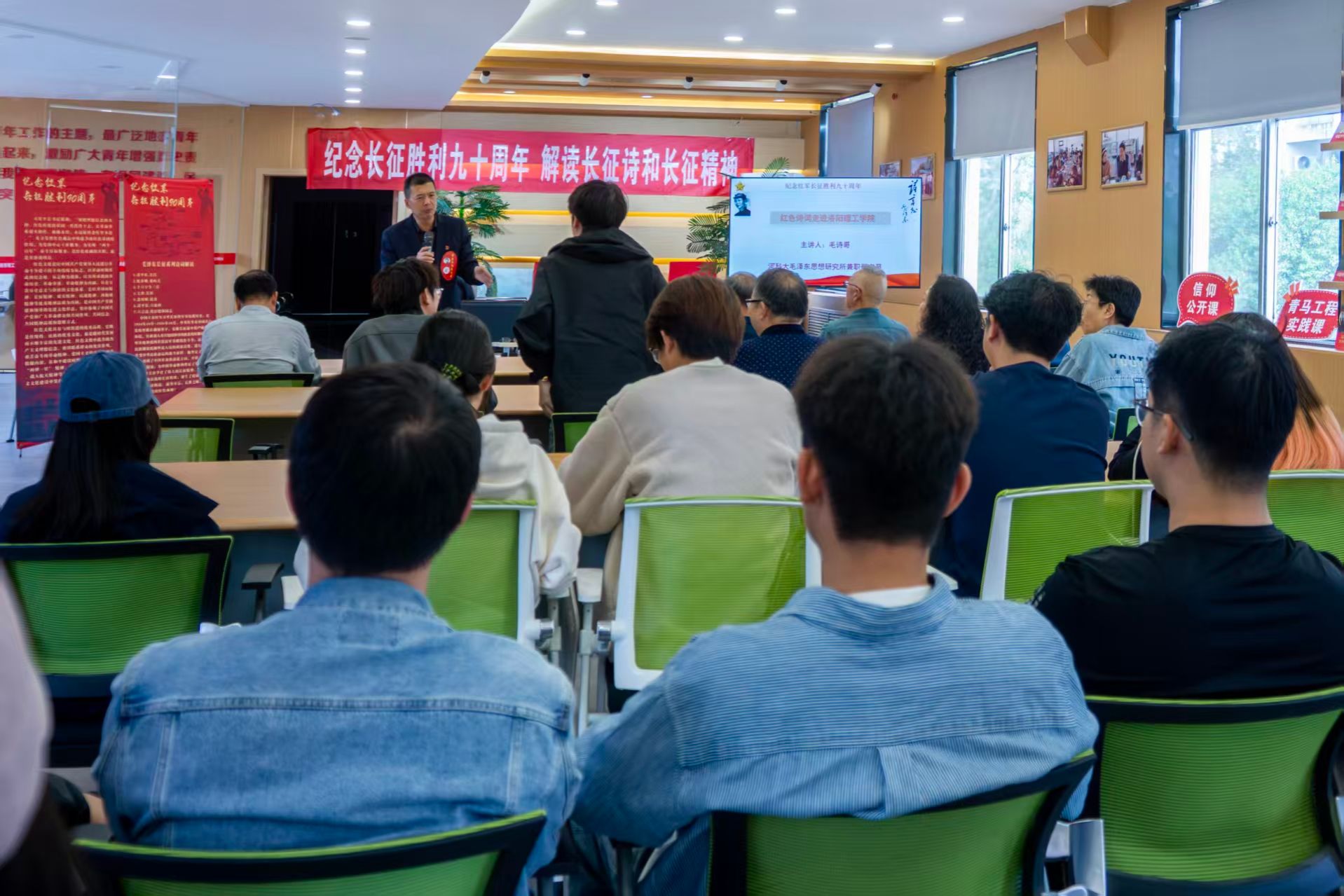 为纪念红军长征胜利90周年,赓续红色血脉,汲取奋进力量,4月9日下午,校团委、凭栏文学社在开元校区团委三楼联合举办“信仰公开课”专题活动。活动特邀洛阳毛泽东诗词研究会副会长、河南科技大学毛泽东思想研究所研究员刘富强老师担任主讲,为校“青马工程”培训班学员带来一场以“长征诗词与长征精神”为主题的生动解读。