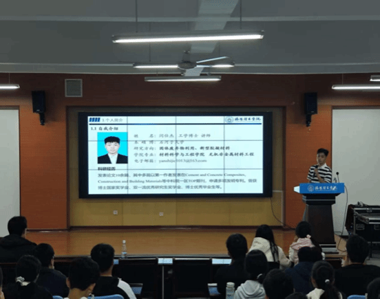 闫仕杰老师在讲座开篇以国家“双碳”战略目标为宏观背景,深入剖析了固废资源化研究的重大意义,系统阐述了该领域的关键技术突破路径及其在绿色建材方向的产业化前景,为构建资源节约型、环境友好型社会提供了坚实的材料学依据与支撑。
