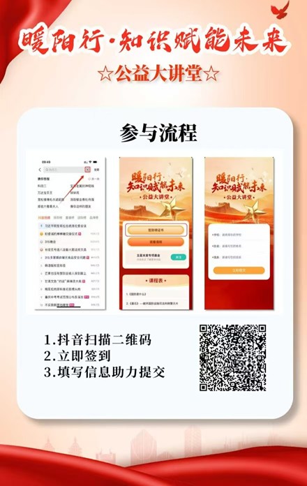 “暖阳行·知识赋能未来”公益大讲堂已为你备好干货满满的课程与专属证书,快跟着参与流程,按时听课、完成打卡,一起在学习中收获成长,用知识为自己的未来添砖加瓦吧!期待你的加入。